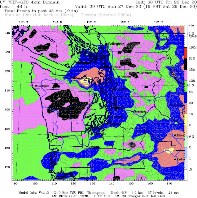The blend of 4 forecast models for Puyallup shows strong gusts of 30-50 mph prior to the cold front. Expect similar winds around the area. Be prepared for localized tree damage and isolated power outages.Another aspect of this weather system will be the temperatures. Sunday was warmer than usual, with temperatures of 47-55 degrees most of the day. Temperatures will remain in the mid-40s overnight into Monday, before peaking at 52-57 degrees during the day on Monday. Then, a big swing takes place. Temperatures will drop from 52-57 to 33-43 degrees as the cold front moves through on Monday afternoon. This swing will take place within hours, and it will set the stage for what you've been wanting to know about...