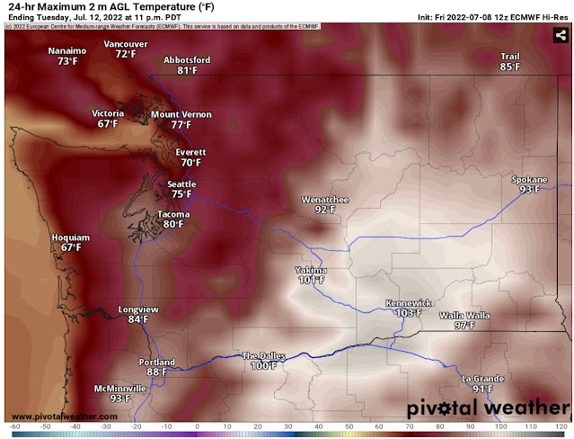 This forecast is a tad cool for the Lowlands. Expect Tuesday’s highs in the lowlands to be in the low 80s (mid 80s for Tacoma southward). Eastern Washington will be sweltering, in the mid 90s to low 100s, with some places reaching the mid 100s. SW WA and the Willamette Valley will reach the mid 80s to low 90s. The coast will be much cooler, with highs only reaching the upper 60s at the ocean beaches.
