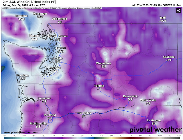 Gap winds will bring frigid wind chills to the lowlands, likely in the upper single digits to mid teens. Eastern Washington will be in the freezer, with wind chills of -20 to +10. The Portland area will also have wind chills in the upper single digits to mid teens, due to winds out of the Columbia River Gorge.While snow is quite uncertain, confidence is high in significant cold. Begin making preparations now to protect people, pets, and plants (the 3 P's of cold weather). Remember that being outside for long periods of time with these wind chills causes frostbite to occur much sooner. Stay tuned!