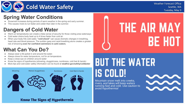 One quick note at the end of the blog. As I mentioned in the FastCast, there is a very high danger of shock and hypothermia if you are recreating in area waterways. The very helpful infographic below from NWS Seattle shows the dangers of cold water. (Click on it to zoom in)