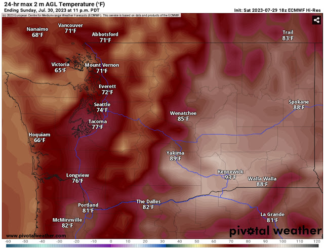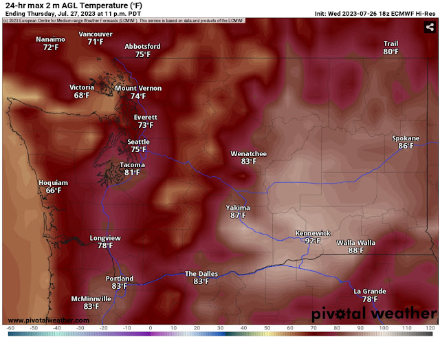 Expect lowland highs in the mid to upper 80s, except in the upper 70s to low 80s near the water. From Tacoma south, highs will reach the mid 80s to low 90s, the Willamette Valley will reach the low to mid 90s, and the coast will reach the upper 60s on the beaches and low 80s inland. Eastern Washington will reach the mid 80s to mid 90s.Wednesday will be the hottest day for areas west of the Cascades, as seen below in the European model forecast.