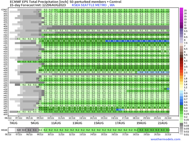 This is a very interesting forecast. It shows the potential for up to 0.2” of rain by midday Monday, and has some ensemble members showing much more rain (up to 1”) in Seattle, but others show only 0.1” more rain through Wednesday.