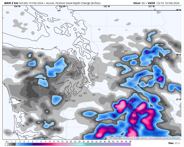 This forecast highlights some areas for potential snow, mainly areas west of Puget Sound and in the North Sound. One thing to note is that much of this forecasted accumulation won't happen, but this is good for seeing where a higher probability of accumulating snow exists. Be aware if you're along Hood Canal and in the hills along the WA coast.