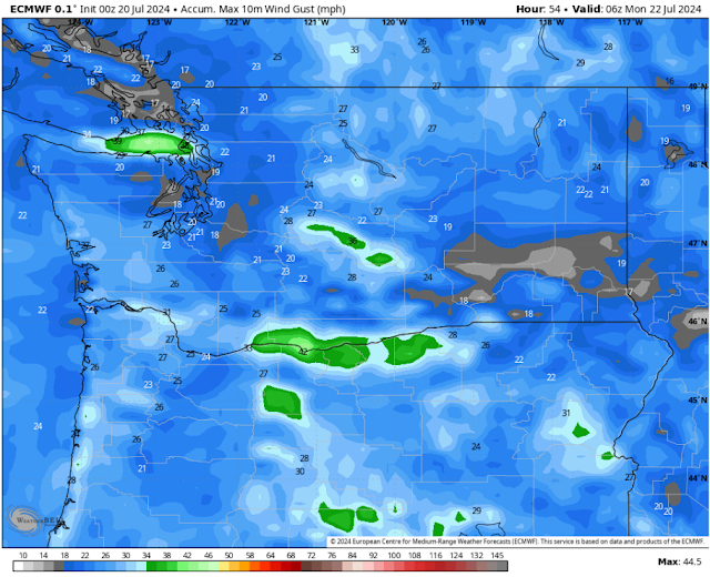 Notice a significant warmup after the rain moves through, with potential for quite a warm Seafair weekend, with highs in the mid to upper 80s (or warmer) possible.